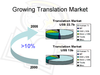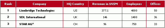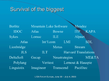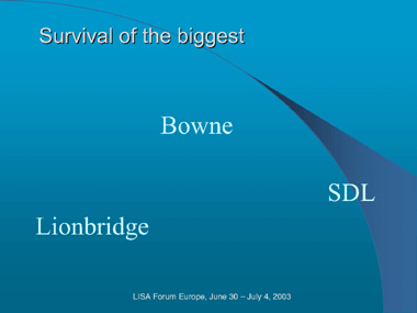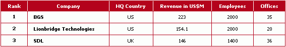 现在只剩三巨头 According to Kim Harris' presentation LISA London 2003 近期并购 在刚刚过去的 6 月,并购事件不断发生。 首先,SDL 宣布以 6 千万美元的价格收购 Trados。Trados 是本地化行业 CAT(Computer Aid Translation) 工具领域的领头羊,其翻译记忆库系列产品几乎为业界标准。SDL 虽然有同类工具 SDLX,但由于 SDL 同时也提供本地化服务,即是工具提供商,又是服务提供商。因此,其竞争对手较少采用 SDLX。在收购完成后,市场上似乎没有“中立”的工具了。对于整体此行业来说,不知是福是祸。 时隔不久,更具有爆炸性的新闻是 LionBridge 宣布以 1.8 亿美元的价格收购 BGS。收购前,三巨头的情况