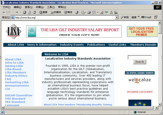 图为本地化行业协会(LISA)的网站主页,LISA的诞生标志着全球信息本地化服务行业的形成