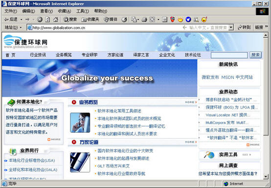 国内软件本地化行业的专业交流网站投入运行。过去国内软件本地化行业的信息交流十分闭塞,行业的公众认知度很低,虽然国内本地化公司都有各自的网站,但网站内容大多是关于公司及其业务的介绍,缺少同行间直接交流的公众平台。而今,这种状况将随着国内首家面向软件本地化行业信息交流的网站—“中国本地化网”的开通并投入运行将发生改变,“中国本地化网http://www.globalization.com.cn”由保捷环球(中国)公司设计与维护,它致力于软件本地化技术领域知识资源的深度挖掘,提供软件本地化行业技术、管理和市场信息,架起企业、政府、行业人士沟通的桥梁。