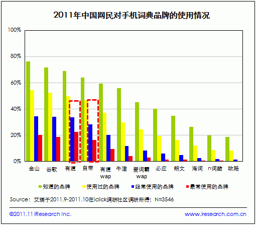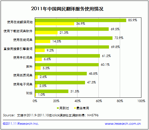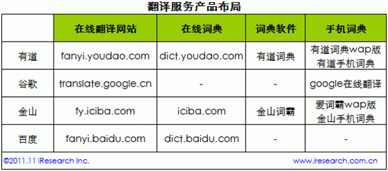 翻译服务多元化发展,在线翻译是最受网民欢迎的服务形式 根据艾瑞2011年9月-10月发起的针对网络翻译服务的网民调研结果,超过6成网民在日常生活、工作和学习过程中会接触或使用到外文;而高达 97%的网民需要借助辅助工具解决外文问题。解决外文翻译需求的渠道包括在线翻译网站、在线词典、词典软件、手机词典,还有传统的电子词典和纸质词典,呈现多元化发展趋势。而在诸多翻译服务中,网民使用率和接受度最高的是在线翻译网站,使用率高达85.9%,36.9%的网民最经常使用在线翻译网站解决翻译问题。 ![]() 纵观网络翻译品牌,谷歌品牌知名度最高,有道用户使用率最高 根据艾瑞此次调研数据,谷歌、金山、有道和百度是用户知名度最高的四个网络翻译服务品牌,知名度均在80%以上,且以上4个品牌分别位列在线翻译网站、在线词典、词典软件等桌面端产品以及手机词典等移动端产品细分市场用户最常使用率前三,前三份额(用户最常使用率)总和均超过80%。艾瑞研究认为,网络翻译服务市场格局趋于稳定,谷歌、金山、有道和百度发展成为主要品牌。 ![]() 受益于其国际品牌影响力,谷歌在翻译服务市场具备先天优势,品牌知名度居第一,使用率居第一,也是用户最常使用的Top3翻译品牌之一。金山是国内最早的翻译服务品牌,发展历史超过10年,拥有大量忠实用户,在翻译服务市场的产品布局也较为完备,其用户知名度仅微低于谷歌居第二,用户最常使用率也居前三。作为后起品牌,有道在缺乏翻译服务市场先发优势以及百度、谷歌搜索引擎流量入口资源的情况下,能成为用户最常使用的第一网络翻译服务品牌,艾瑞分析认为,是受益于其全面的产品布局策略以及良好的用户体验和口碑。 ![]() 如上表所示,有道在在线翻译网站、在线词典、词典软件和手机词典等翻译服务市场均有产品布局,是目前网络翻译服务提供商中产品布局最全面的企业之一。根据艾瑞调研数据,有道词典的用户满意度以及净值推荐度也在所有词典软件品牌中位列第一,净值推荐度比行业平均值高7个百分点,良好的用户体验为有道赢得了较好的口碑。 ![]() 手机成为重要的服务载体,预装渠道优势仍较为突出 在有翻译服务使用需求的网民中,6成曾经用到过手机词典,手机已经成为重要的翻译服务载体,金山、谷歌、有道、必应等众多翻译服务提供商也纷纷布局移动端市场,并取得较高的用户知名度,有道则成为用户最常使用的手机词典品牌,手机预装(自带)仍然是用户认可度和接受度较高的渠道,值得各个服务提供商关注。 ![]() 根据艾瑞网民行为监测产品iUserTracker(IUT)的监测数据,在线翻译服务(网站,不包括词典软件)的网民覆盖已经由2007年3 月的1787万人发展到2011年3月的7453万人(3月为2011年覆盖人数最多月份,与年度用户规模差距最小),年复合增长率为42.9%,网络翻译服务的用户量正在以较快的速度稳定增长。在全球化发展趋势下,外文学习和使用的覆盖面正在日益扩大,方便快捷的网络翻译服务正在帮助越来越多的网民解决工作、学习和生活中遇到的各种外语问题,相信网络翻译服务将具备更大的市场发展潜力。