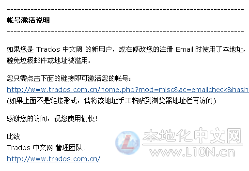 ![]() 等待几分钟后,会收到一封标题为“[Trados 中文网] Email 地址验证”的邮件,并附有“帐号激活说明”。只需按照说明,点击其中的链接即可成功激活。 ![]()