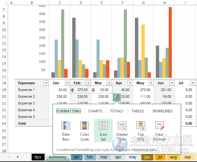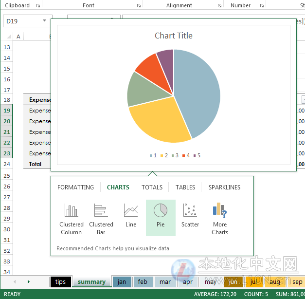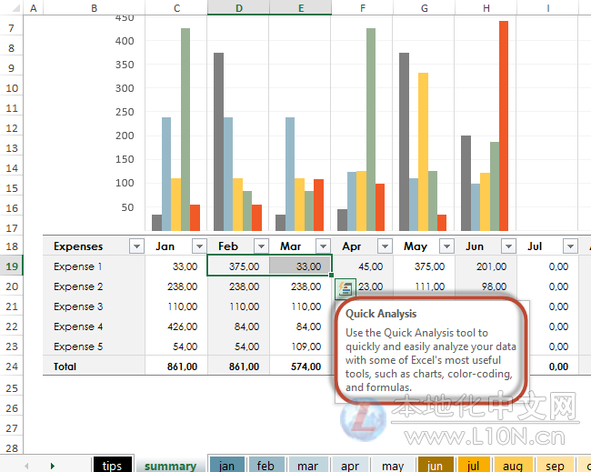 Excel 2013 和 Excel 2010 相比变化不是很大。但 2013 增加了一个 Quick Analysis (快速分析)工具,当你选中一些数据后,旁边会出现一个小的“快速分析工具”图标,点击该图标,Excel 会给出一些建议,可以轻松地改变数据样式、图表类型等,非常方便快捷。